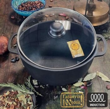 Т404С3 Каструля чавунна лита 6л зі скляною кришкою “S&T”