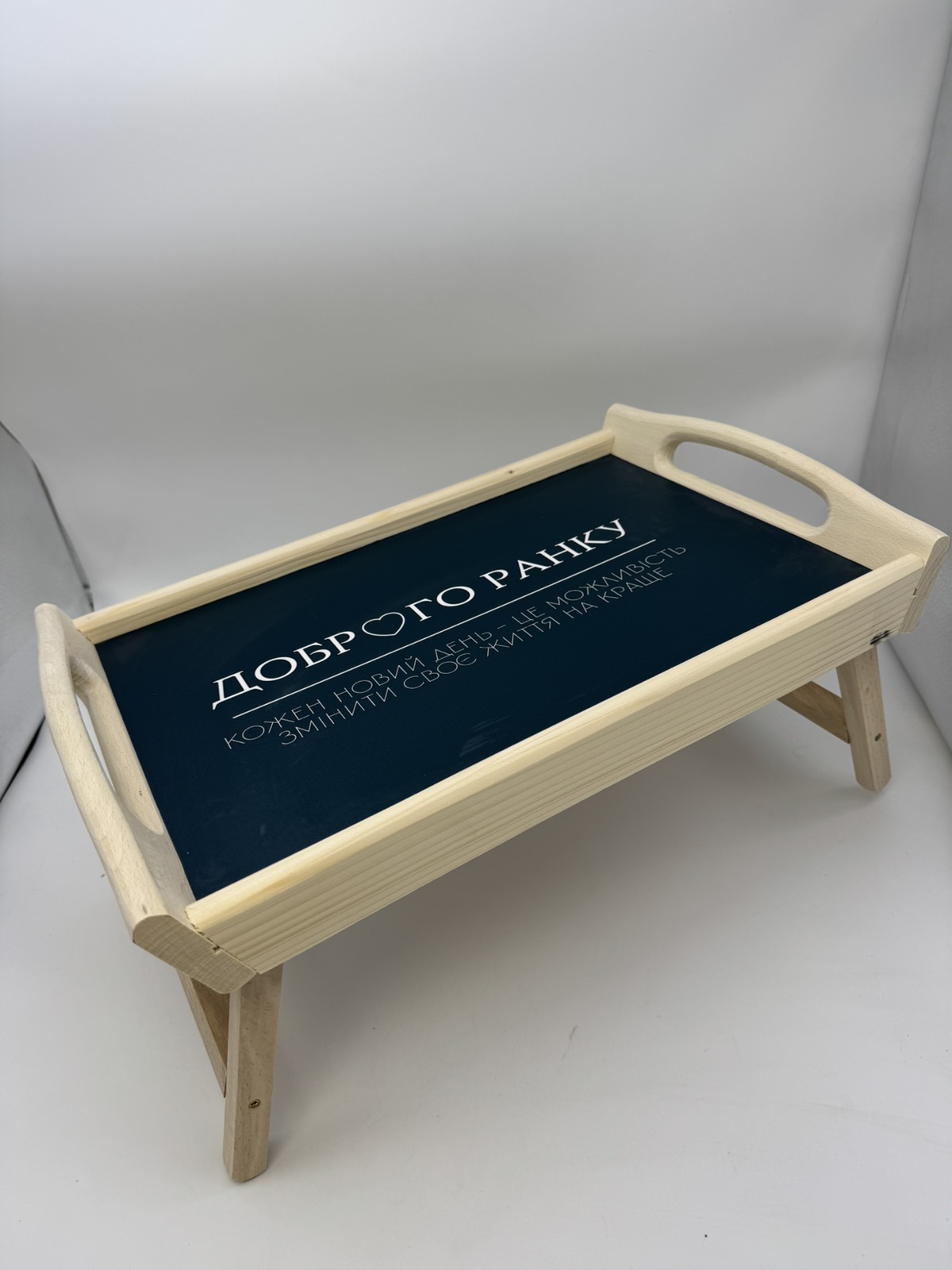 Дерев’яний складний “столик-піднос” оснащений зручними ручками та бортиками по краях, що запобігають зісковзування посуду. Складені ніжки столика надійно фіксуються під дном, завдяки чому його можна використовувати як піднос. Складаний “столик-піднос” зручна і практична річ. Столик дозволяє поїсти з комфортом у теплому, затишному ліжку, наприклад, перед телевізором, при цьому Ви нічого не проллєте, і всі крихти залишаться на поверхні столика, а не на постільній білизні. Складаний столик-піднос це ще й відмінний атрибут для створення романтичної обстановки, адже гарно поданий смачний сніданок у ліжко коханій людині, це приємний початок чудового дня.