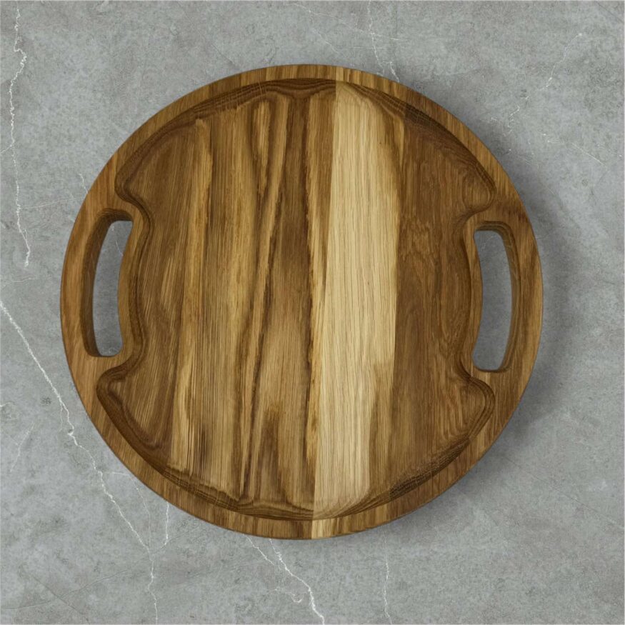Головна Каталог Кухонне приладдя Дошки для нарізання продуктів Менажниця дубова для піцци з ручками 30см