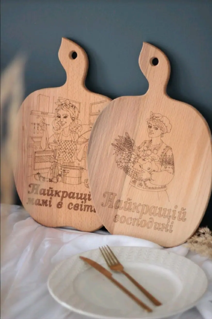 Головна Каталог Кухонне приладдя Дошки для нарізання продуктів Дошки кухонні дерев'яні Доска дерево яблуко з декором(25*20)