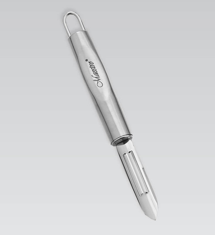 Овочечистка з нержавіючої сталі Maestro MR 1717 розміром 22х2,4х2,0 см призначена для безпечного чищення овочів від шкірки. Спеціальна конструкція леза дозволяє швидко та зручно видаляти шкірку з овочів та фруктів, виключаючи при цьому можливість порізати пальці.