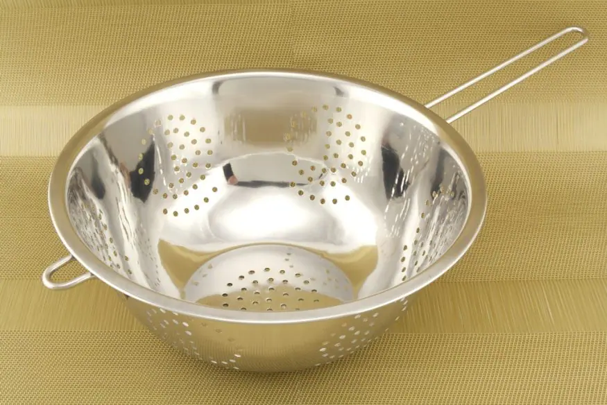 Друшлаг виготовлений з високоякісної нержавіючої сталі, що забезпечує цьому товару надійність і довговічність у використанні. Наявність довгої ручки дозволяє безпечне і зручне використання цього незамінного посуду на кухні. Друшлаг з нержавіючої сталі можливо використати як в гарячій, так і холодній воді, він легко миється і має презентабельний вигляд. Перевагою є невелика вага і раціональність. Застосуємо для приготування дитячого харчування.