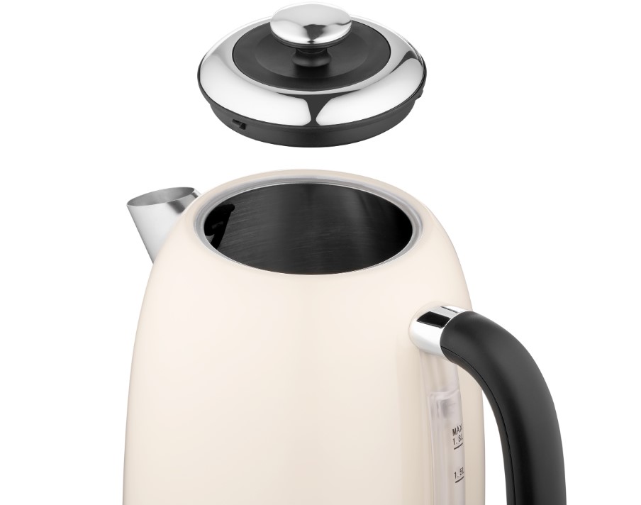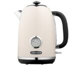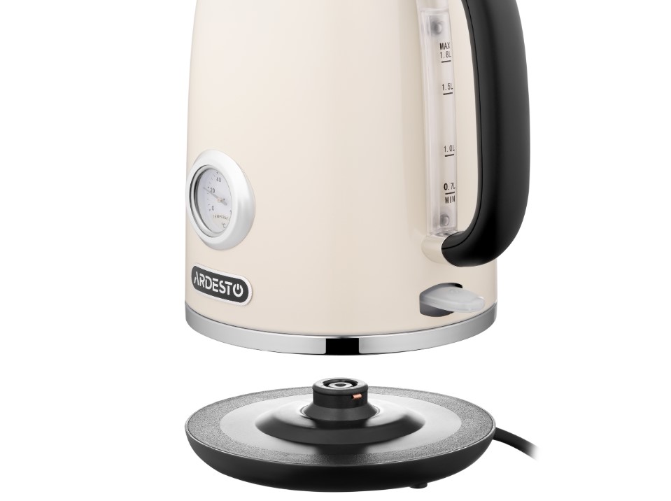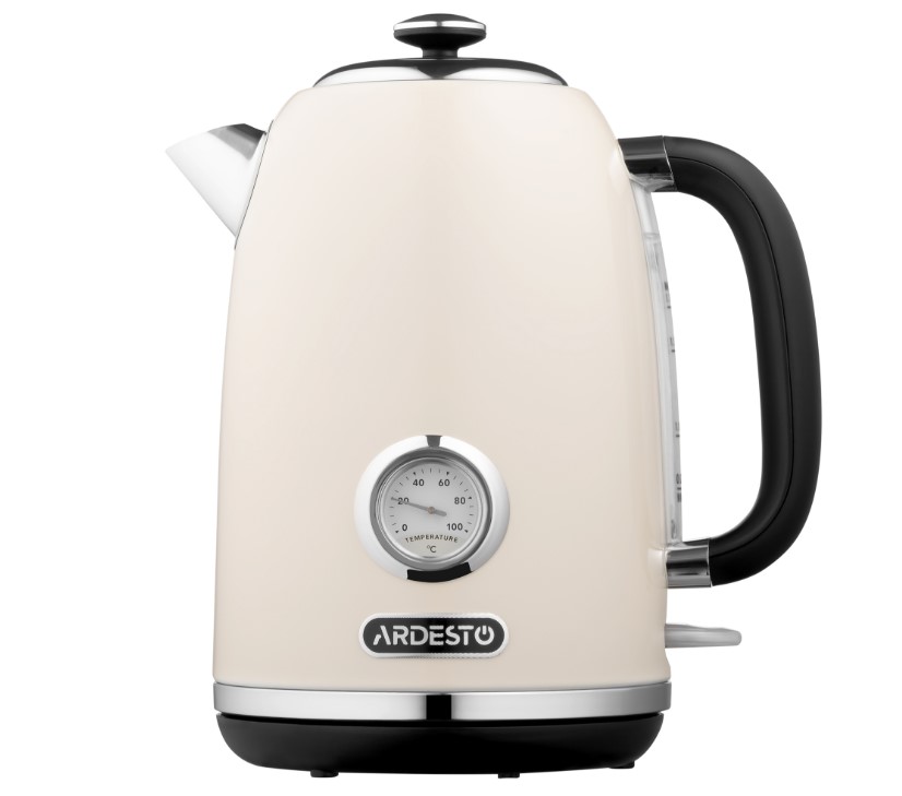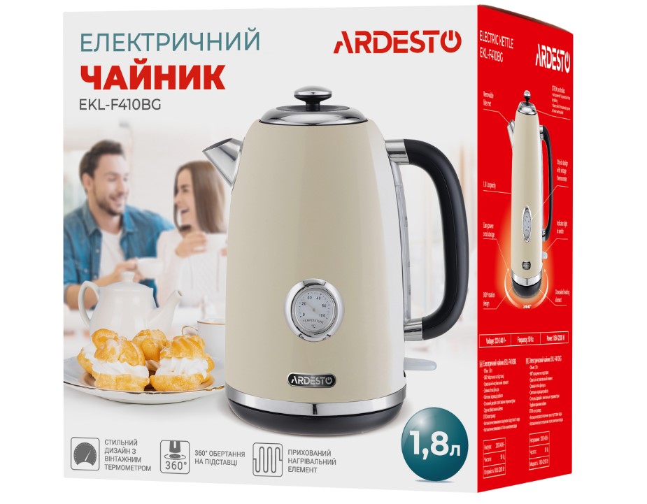 Електричний чайник ARDESTO EKL-F410BG бежевого кольору. Корпус із нержавіючої сталі, ручка ергономічна. Модель оснащено британським контролером Strix. Передбачено функцію вимикання в разі відсутності води та після її закипання. Потужність становить 2 200 Вт, а об’єм – 1,8 л. Зручна підставка обертається на 360°. Оснащено вінтажним індикатором температури. Має знімний фільтр від накипу. Нагрівальний елемент прихований.