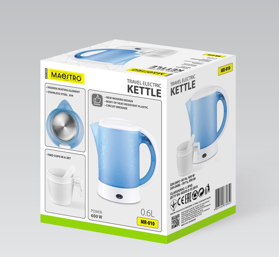 MR-010 Ел. чайник 0,6л + 2чашки дорожній 600ВТ Maestro