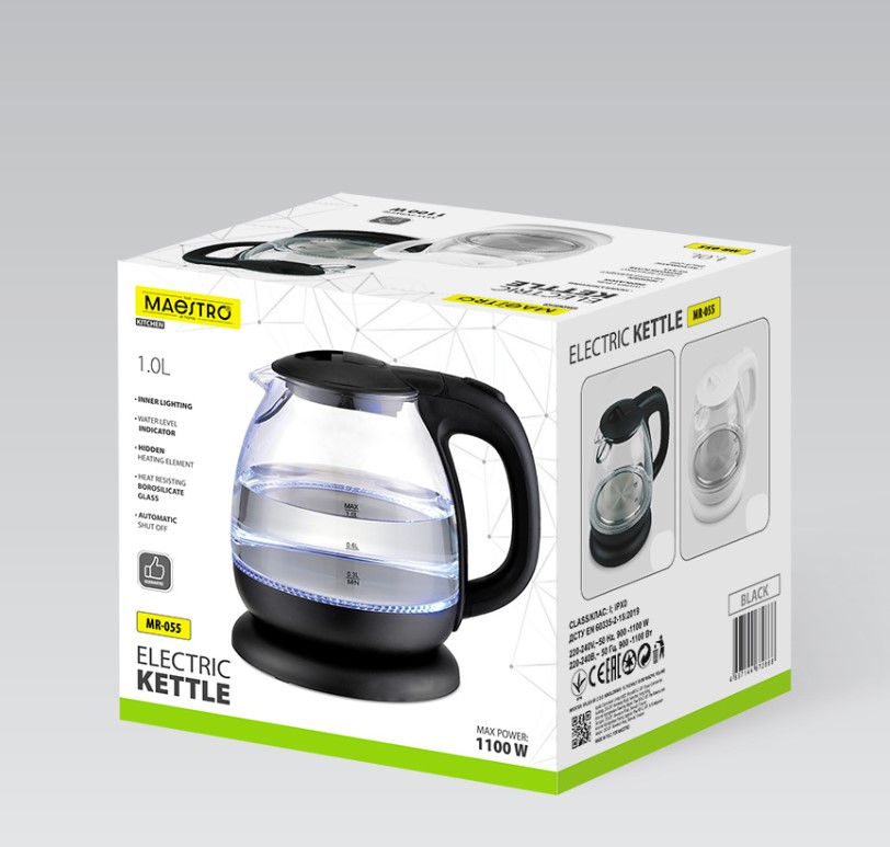 Електрочайник MR-055 Black скло 1л 1100ВТ Maestro