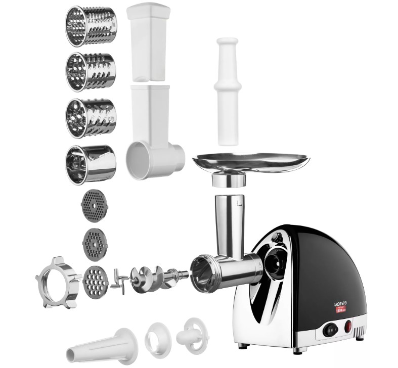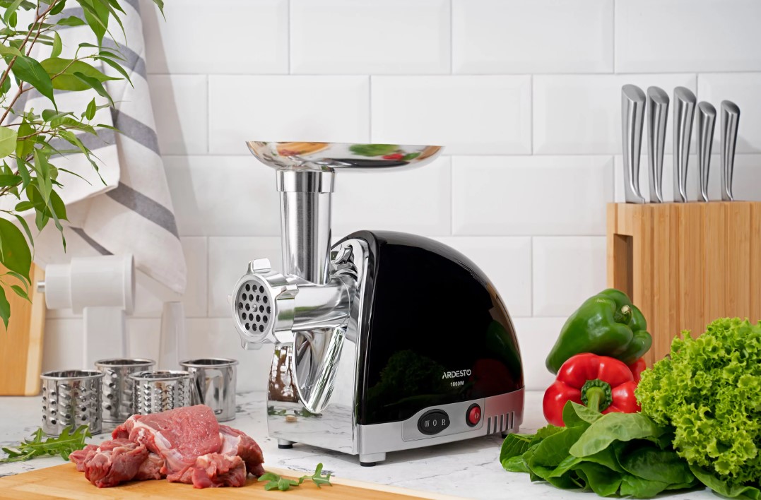 М’ясорубка з потужністю 1800 Вт, змінними насадками для приготування фаршу, домашніх ковбасок та кеббе, а також насадкою для терки та шинкування.