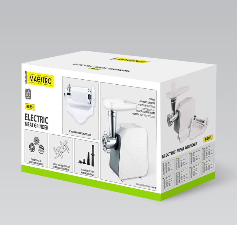 MR-851 М’ясорубка 1500Вт Maestro (насадки для томат.соку, ковбас, насад. “кебе”)