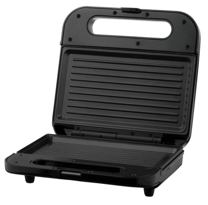 Сендвічмейкер чорного кольору з потужністю 700 Вт та однією пластиною для приготування різноманітних сендвічів, паніні, овочів гриль та грибів.