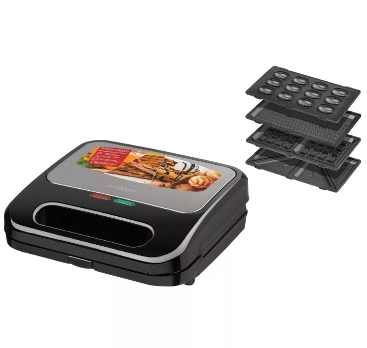 Мультимейкер чорно-сірого кольору з потужністю 700 Вт та чотирма знімними пластинами для приготування сендвічів, паніні, овочів гриль, грибів, різноманітних вафель, а також печива «Горішок”.