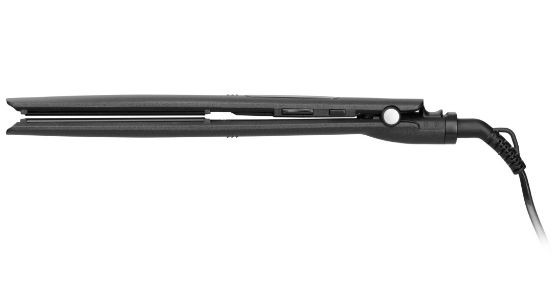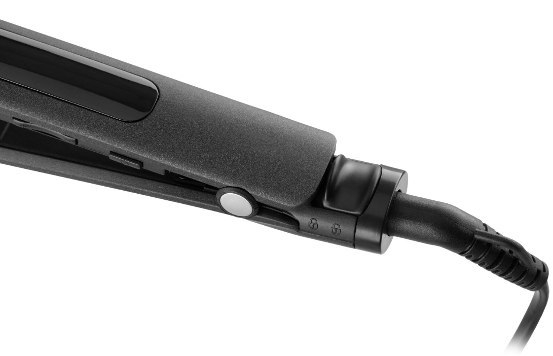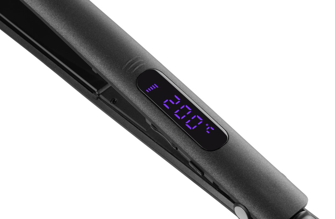 Плойка чорного кольору з керамічним покриттям та електронним керуванням для випрямлення волосся та створення локонів.
