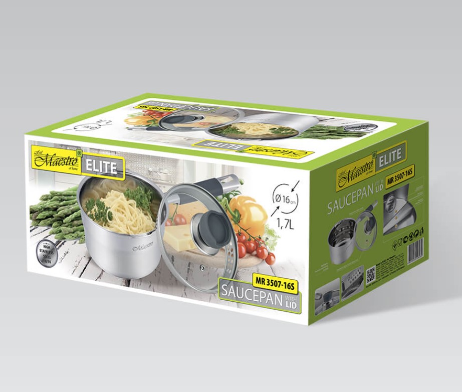 Ківш Maestro MR 3507-16S об’ємом 1,7 літра призначений для приготування їжі на будь-яких джерелах тепла, виготовлений з високоякісної нержавіючої сталі. Ручка ковша і ручка кришки ковша мають термоизолирующую накладку. Скляна кришка діаметром 16 см оснащена отвором для випускання пари і отворами для зливу рідини.