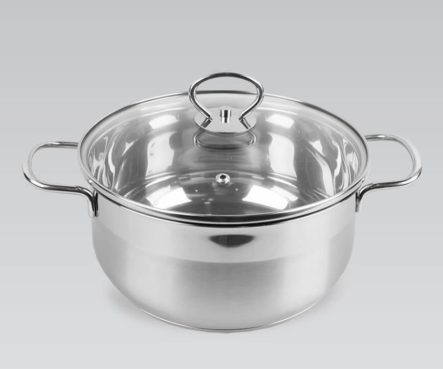 Каструля Maestro MR 3508-26, діаметром 26 см, об’ємом 7,0 літрів виготовлена з нержавіючої сталі, має багатошарове капсульне дно, що дозволяє використовувати будь-які джерела тепла, включаючи індукцію. Великі зручні металеві ручки каструлі без накладок дозволяють готувати як на відкритому вогні, так і в духовці. Скляна кришка з отвором для пари.