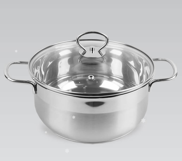 Каструля Maestro MR 3508-30, діаметром 30 см, об’ємом 10 літрів виготовлена з нержавіючої сталі, має багатошарове капсульне дно, що дозволяє використовувати будь-які джерела тепла, включаючи індукцію. Великі зручні металеві ручки каструлі без накладок дозволяють готувати як на відкритому вогні, так і в духовці. Скляна кришка з отвором для пари.