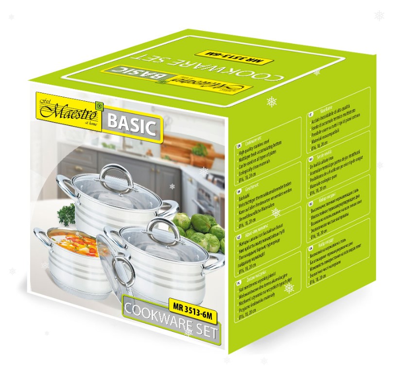 Maestro MR3513-6M це набір з 3х каструль, об’ємом 2,1 / 2,9 / 3,9 літрів. Каструлі виготовлені з високоякісної нержавіючої сталі. Мають багатошарове термоакумулююче дно підходяще для всіх типів джерел тепла, включаючи індукцію. Товста стінка сприяє більш швидкому і рівномірному прогріванню вмісту каструлі. Ручки кріпляться надійним клепочним кріпленням.