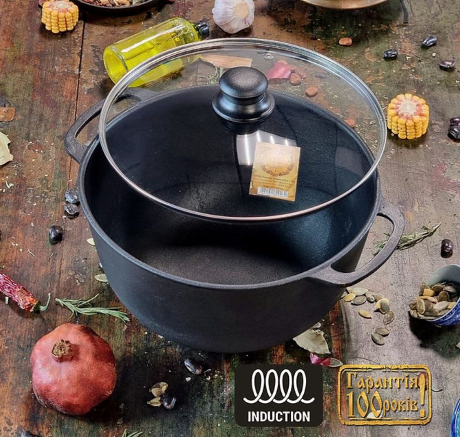 Т404С3 Каструля чавунна лита 6л зі скляною кришкою “S&T”