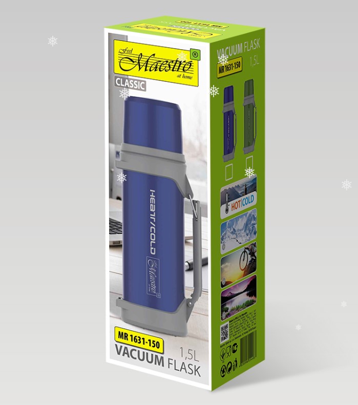 Термос Maestro MR 1631-150 New об’ємом 1,5 літра. Нова модель термоса МР 1631 випускається в двох колірних варіантах виконання корпусу: синій та зелений. Термос виготовлений з нержавіючої сталі, стійкий до механічних впливів, легко миється і довго зберігає тепло.